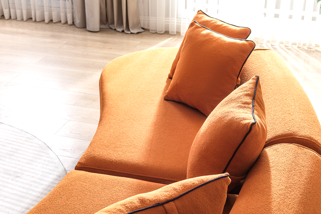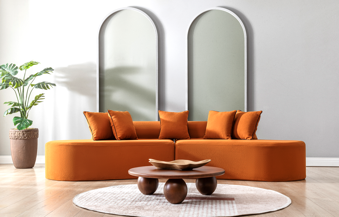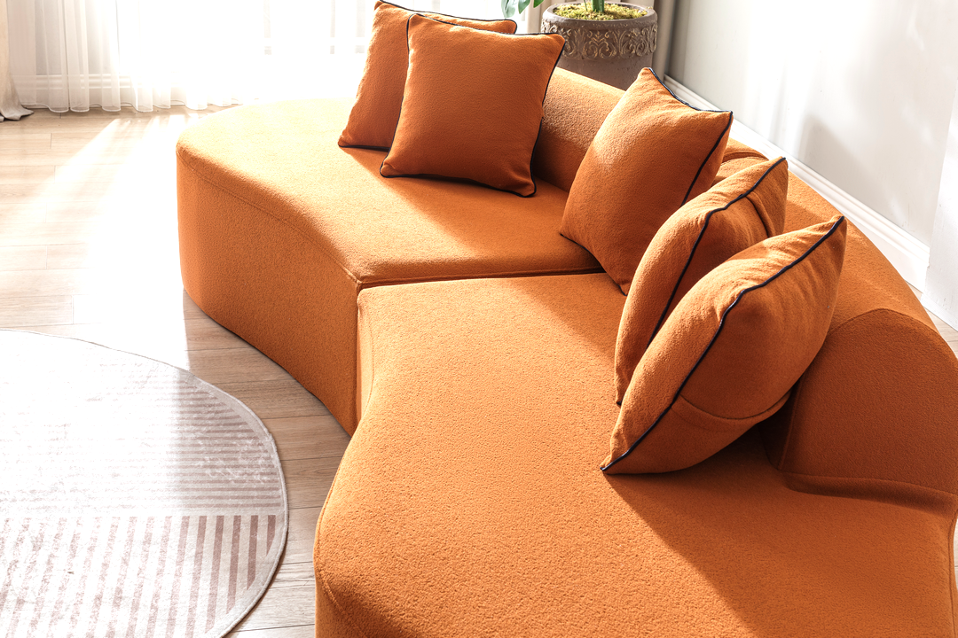 Add a pop of personality to your space with our Curved Modular Sofa in a rich, burnt orange hue. We have other vibrant color options for your unique style. Designed for those who love bold style and exceptional comfort, this chic sofa features a flowing, asymmetric silhouette that instantly elevates any room with it’s aura.