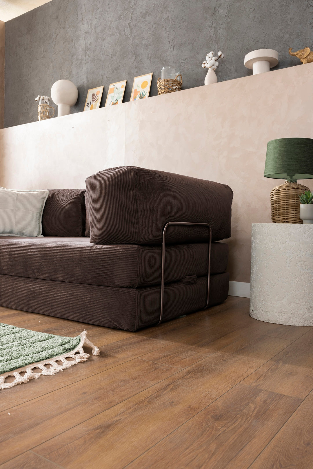 TEDDY consists of two mattresses and two angled cushions, which can be easily moved around. He is held together by three metal bars in chrome-plated iron, which are also mobile. The mattresses are of high quality cold foam and relatively hard, so that they are both good to sit and sleep on. The angled cushions contain shredded foam, surrounded by an inner fabric sleeve, which makes the outer fabric easy to zip off, without interacting with the shredded foam. Last but not least, TEDDY is wrapped in soft corduroy fabric. The fabric is of very high quality and is extremely durable.
