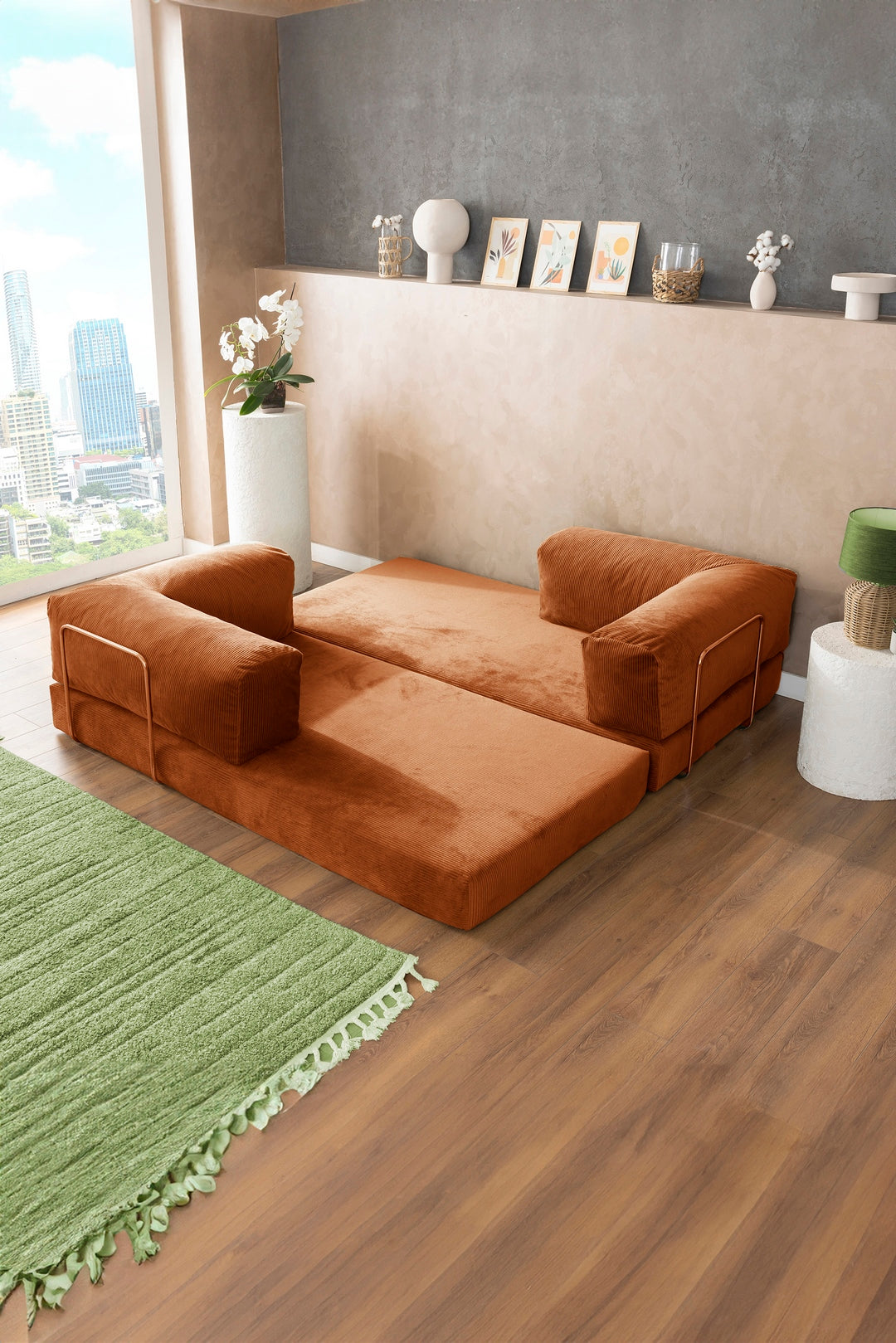 TEDDY consists of two mattresses and two angled cushions that can be easily moved. It is held together by three metal bars in chrome-plated iron, which are also movable. The mattresses are made of high quality cold foam and are relatively firm, making them comfortable for both sitting and sleeping. The angled cushions contain shredded foam surrounded by an inner fabric sleeve that allows the outer fabric to be easily zipped off without interacting with the shredded foam. Last but not least, TEDDY is wrapped in soft corduroy fabric. The fabric is very high quality and extremely durable.