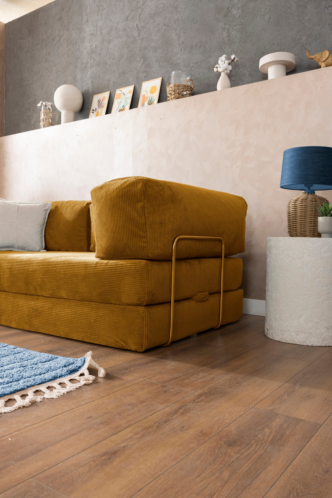TEDDY consists of two mattresses and two angled cushions that can be easily moved. It is held together by three metal bars in chrome-plated iron, which are also movable. The mattresses are made of high quality cold foam and are relatively firm, making them comfortable for both sitting and sleeping. The angled cushions contain shredded foam surrounded by an inner fabric sleeve that allows the outer fabric to be easily zipped off without interacting with the shredded foam. Last but not least, TEDDY is wrapped in soft corduroy fabric. The fabric is very high quality and extremely durable.